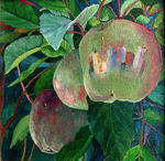 2005geschilderd voor een acrylwedstrijd met als thema stad en land, in een appel wordt de stad gereflecteerd, ingelijst in zilverkleurige lijst