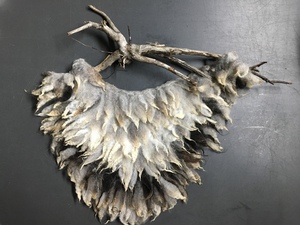 2023ruwe krulletjes als lokken gevilt tot een soort kraag, opgehangen aan een vondst uit de natuur: tak van de appelboom